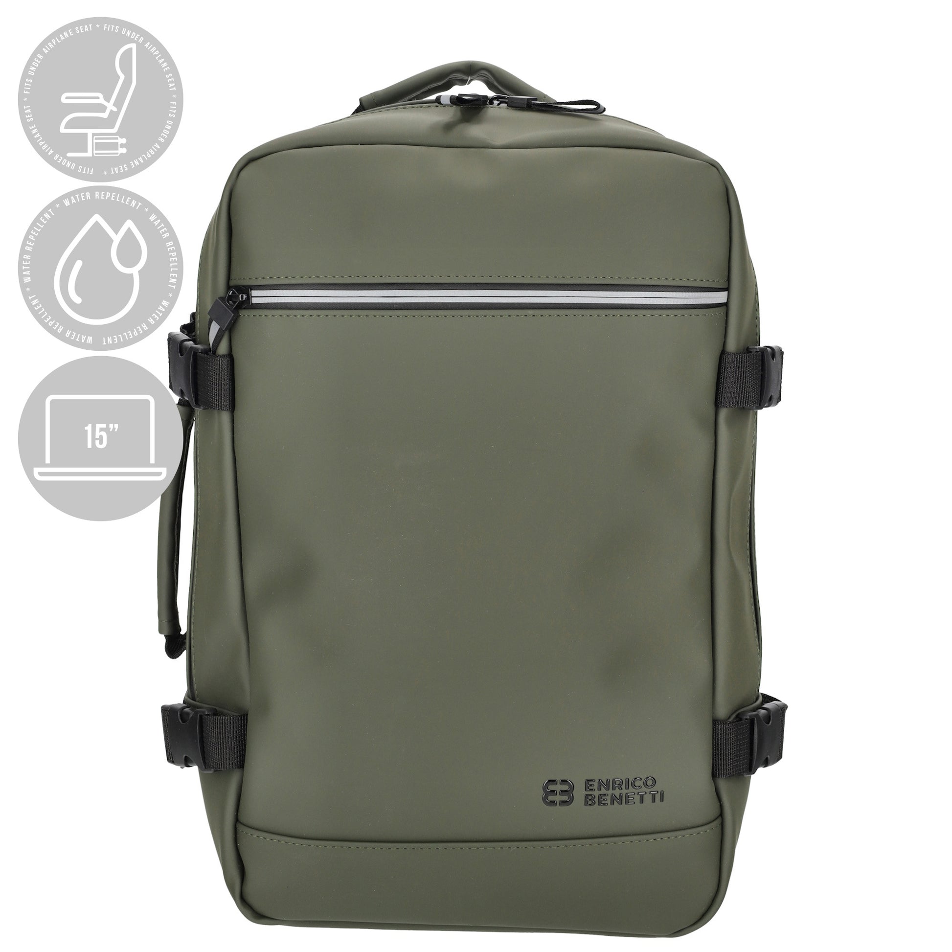 De Enrico Benetti Bergen is een stijlvolle en functionele underseat rugzak voor reizigers die net iets meer ruimte en bescherming willen. Dankzij het vaste underseat-formaat neem je deze rugzak eenvoudig mee als persoonlijk item in het vliegtuig, terwijl je profiteert van een strak design en praktisch ingedeelde vakken.